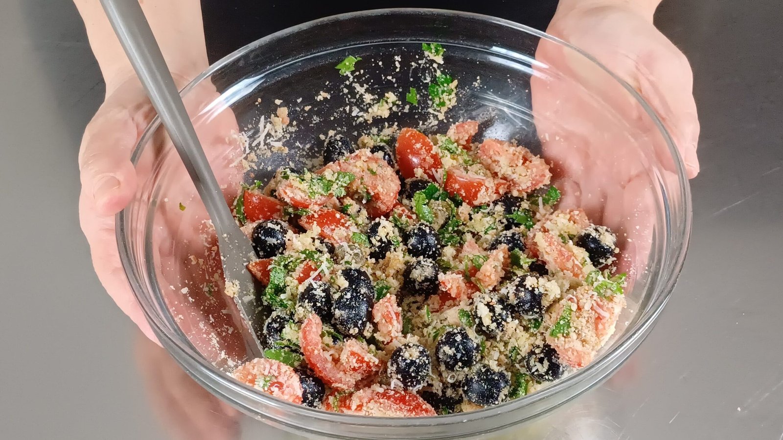 - Prepara la panatura mescolando insieme pangrattato, parmigiano e prezzemolo fresco tritato, olive, capperi e olio evo